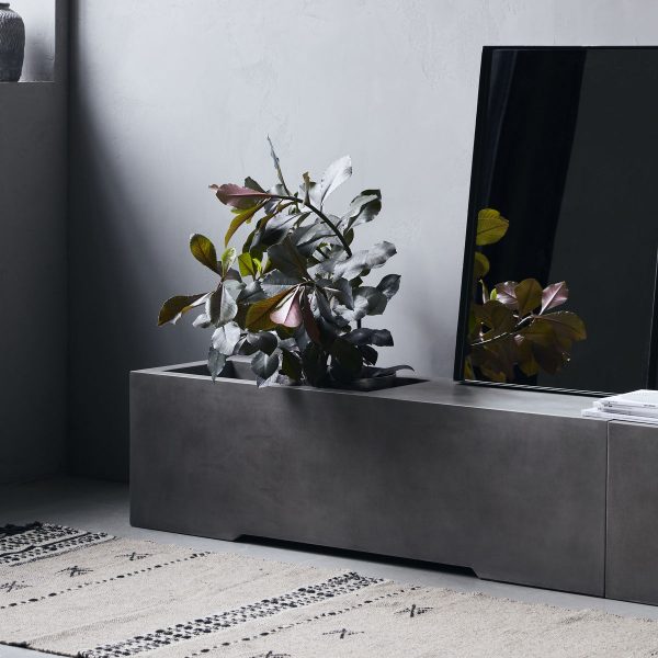 Delvis benk, delvis oppbevaring, denne betongbenken er et must for ethvert hjem. Takket være de rene linjene og det minimalistiske utseendet skaper det en følelse av ro i hjemmet. Bruk den inne i gangen eller utenfor som din nye favorittbenk. Den leveres med et stort rom som du kan bruke til magasiner, en stor plante eller et teppe. Overflaten er dekket med et granittpulver for å gjøre det fantastisk glatt. Hvis du vil ha et materiale som tåler elementene, er betong løsningen.