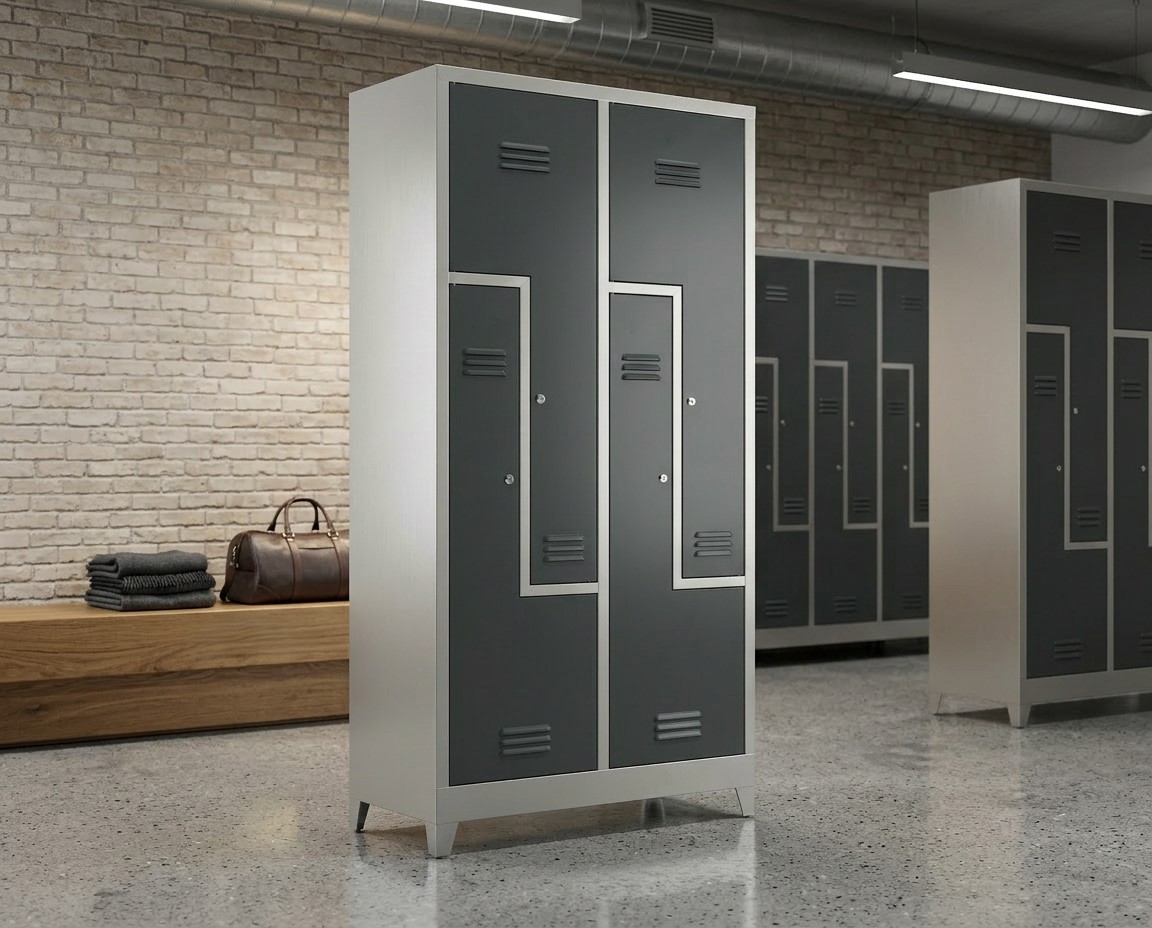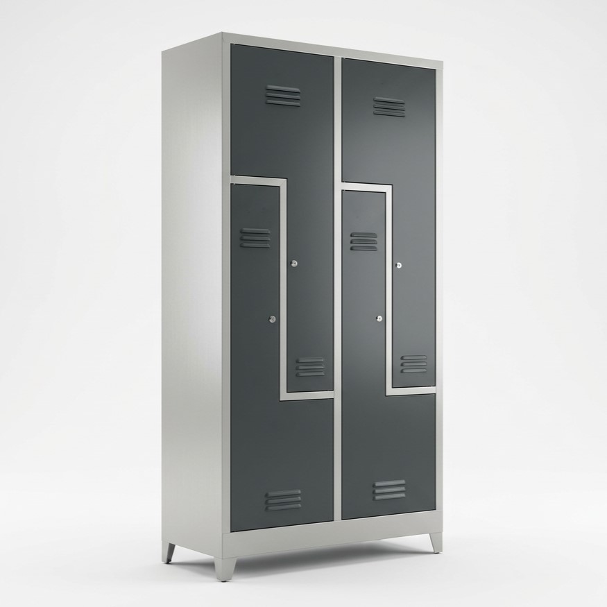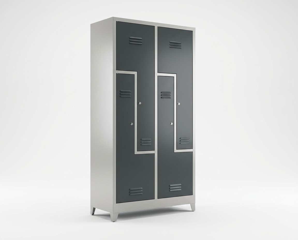 Solid og praktisk garderobeskap i stål fra Degvold, utstyrt med 4 Z-formede dører. Denne løsningen gir effektiv utnyttelse av plassen og gjør skapet godt egnet til garderober i bedrifter, verksteder, skoler og treningssentre.
