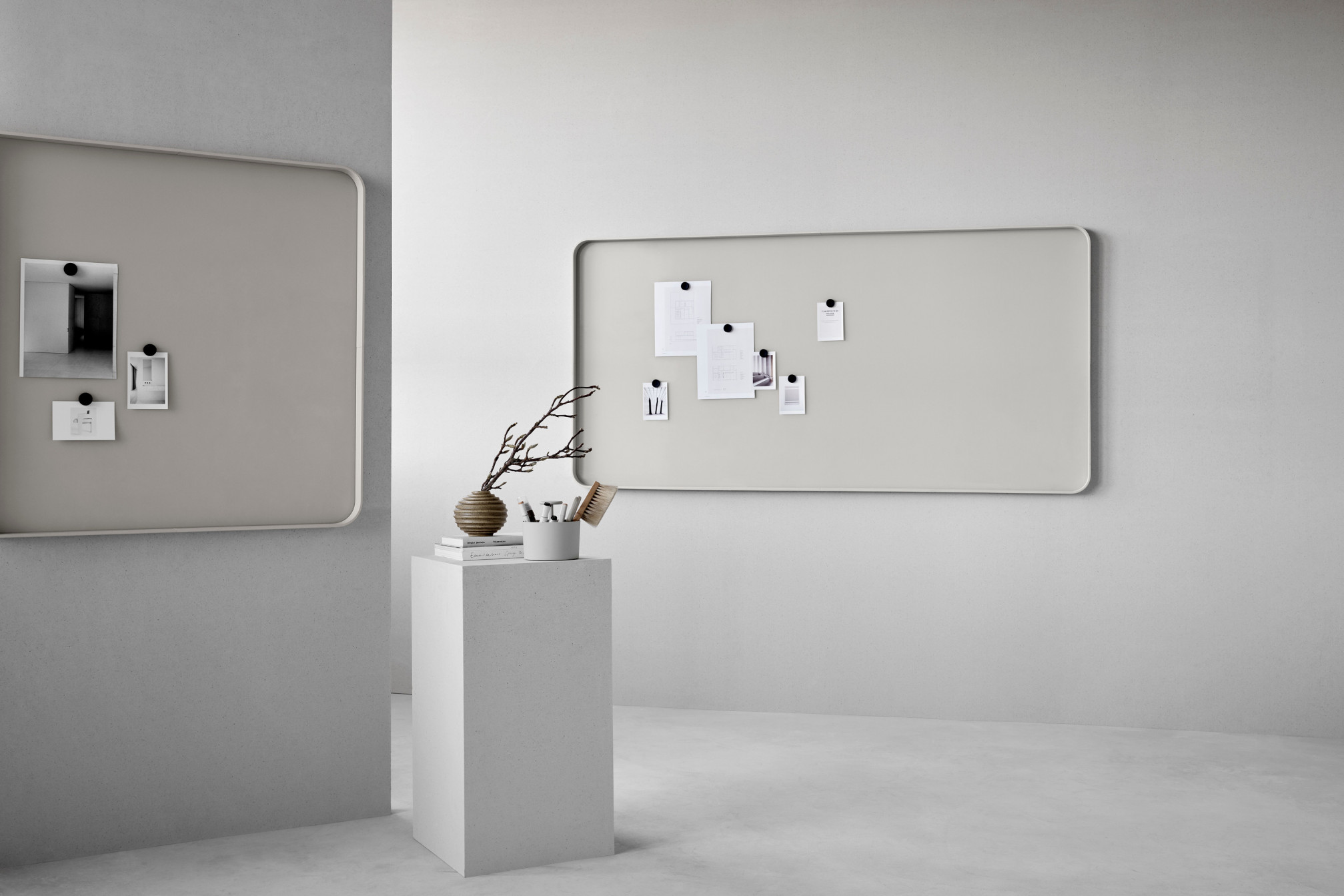 Skrivetavle i glass med myke avrundede hjørner og formpresset treramme. Rammen tilvirkes i eik finer eller grå lakk og avgrenser skriveflaten, samtidig som den fungerer som en naturlig pennehylle. Glasset kan tilvirkes i alle våre 24 standardfarger.