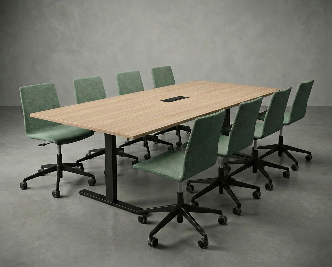Som tilleggsutstyr kan bordet utstyres med kabelkrybbe under bordplaten og integrerte uttak for strøm, USB, HDMI og mer – perfekt for moderne møterom.
